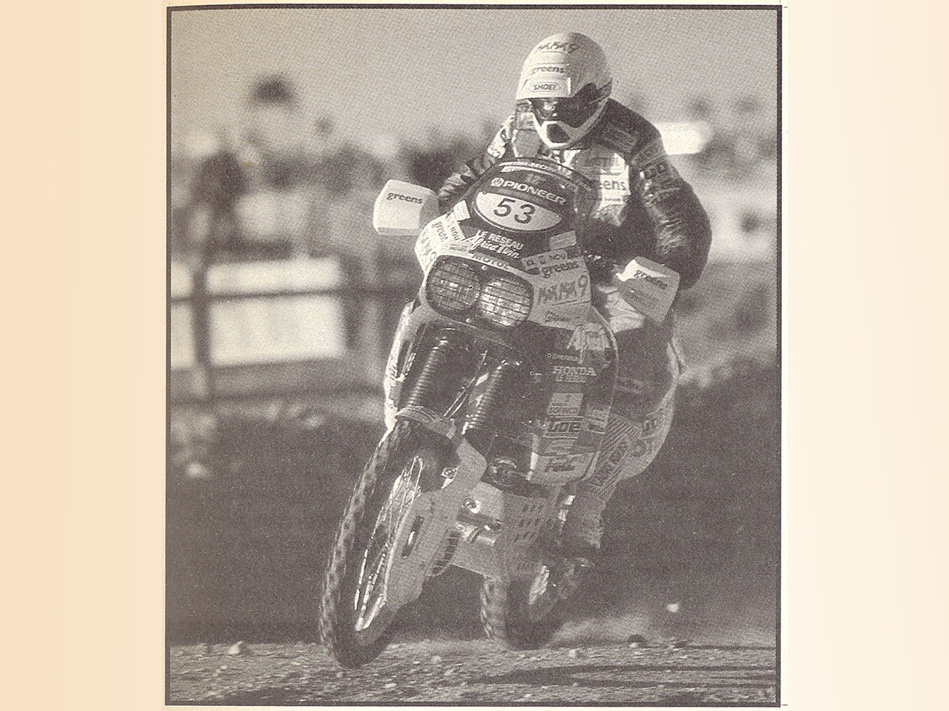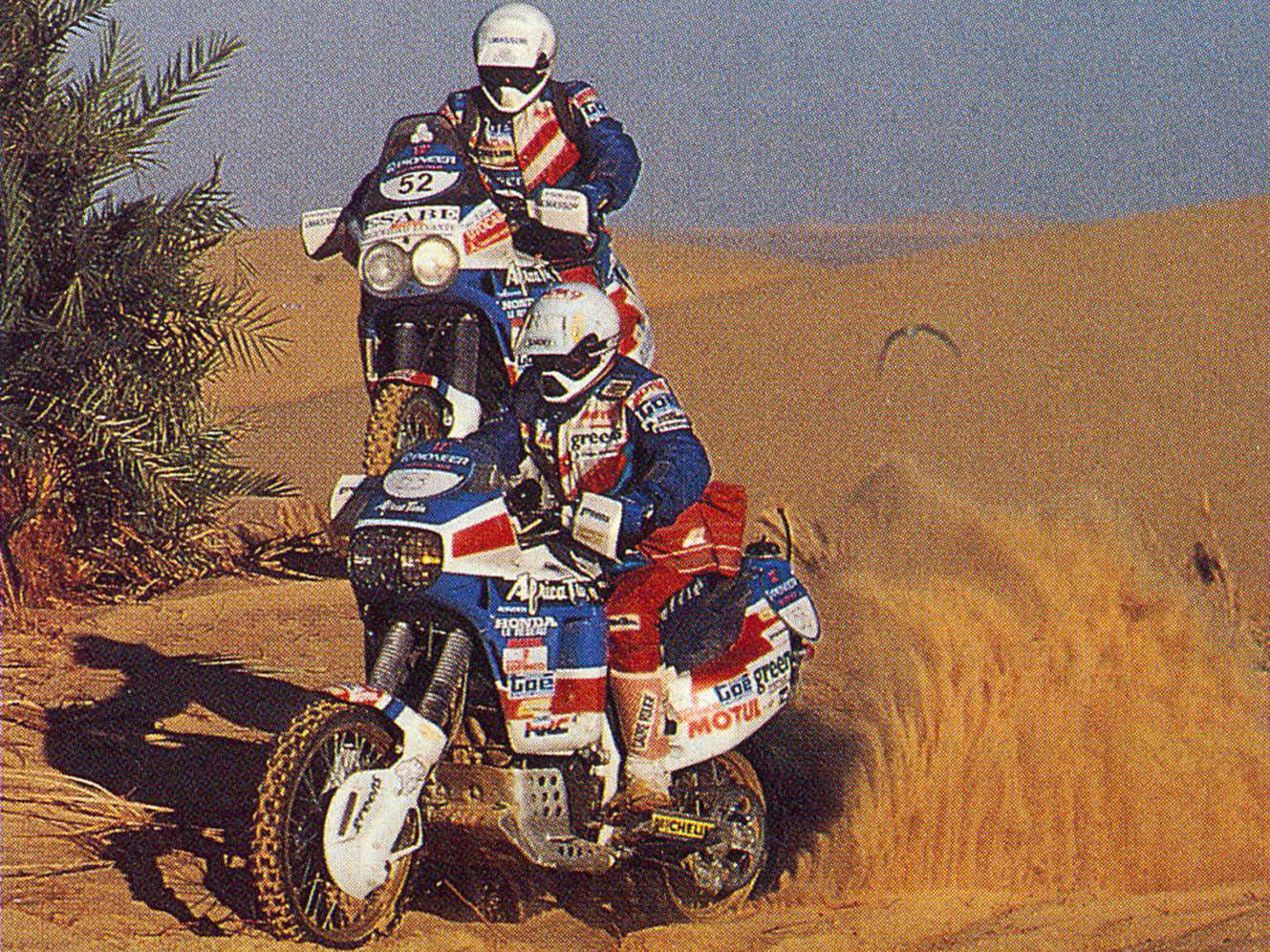Honda won the Paris-Dakar Rally with their NXR750 prototype in 1986, 1987, 1988 and 1989. An incredible string of victories! The first Africa Twin was released in 1988 evoking their racing success. But Honda wasn’t finished. In 1989 and 1990, Honda France entered 50 modified Africa Twins in the Marathon class of the Paris-Dakar Rally and, amazingly, they won.