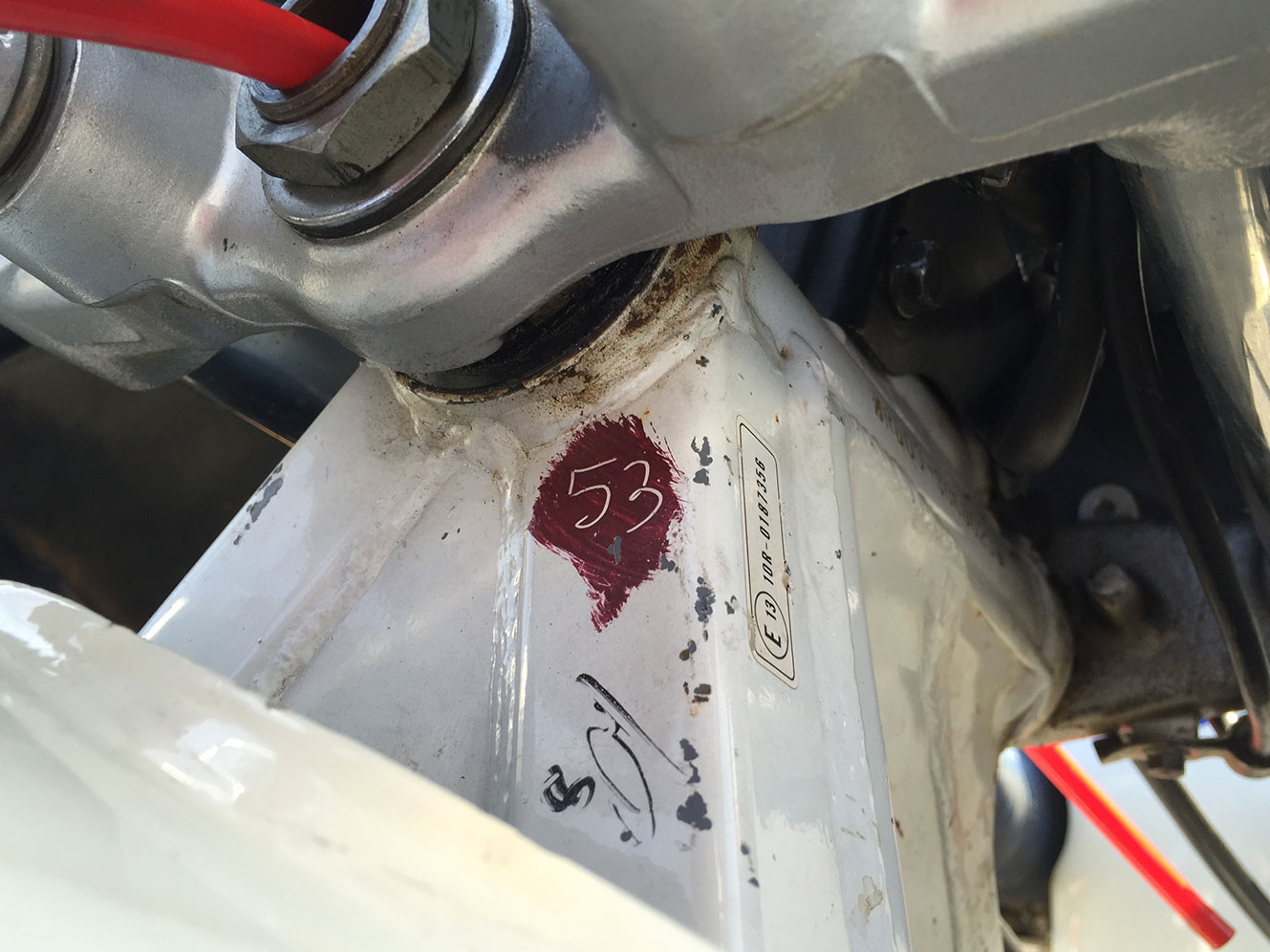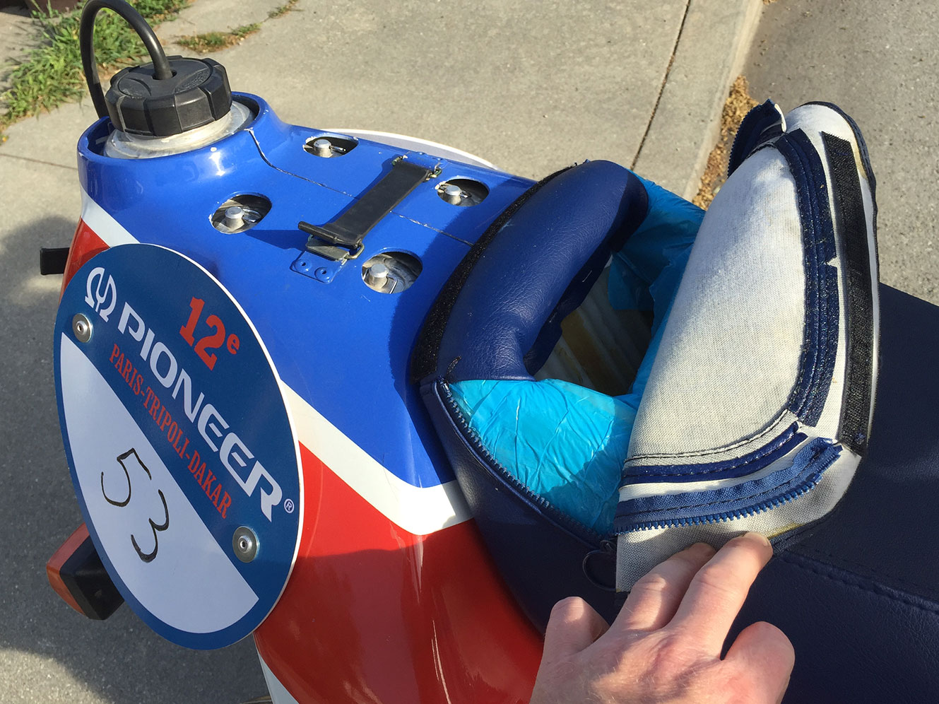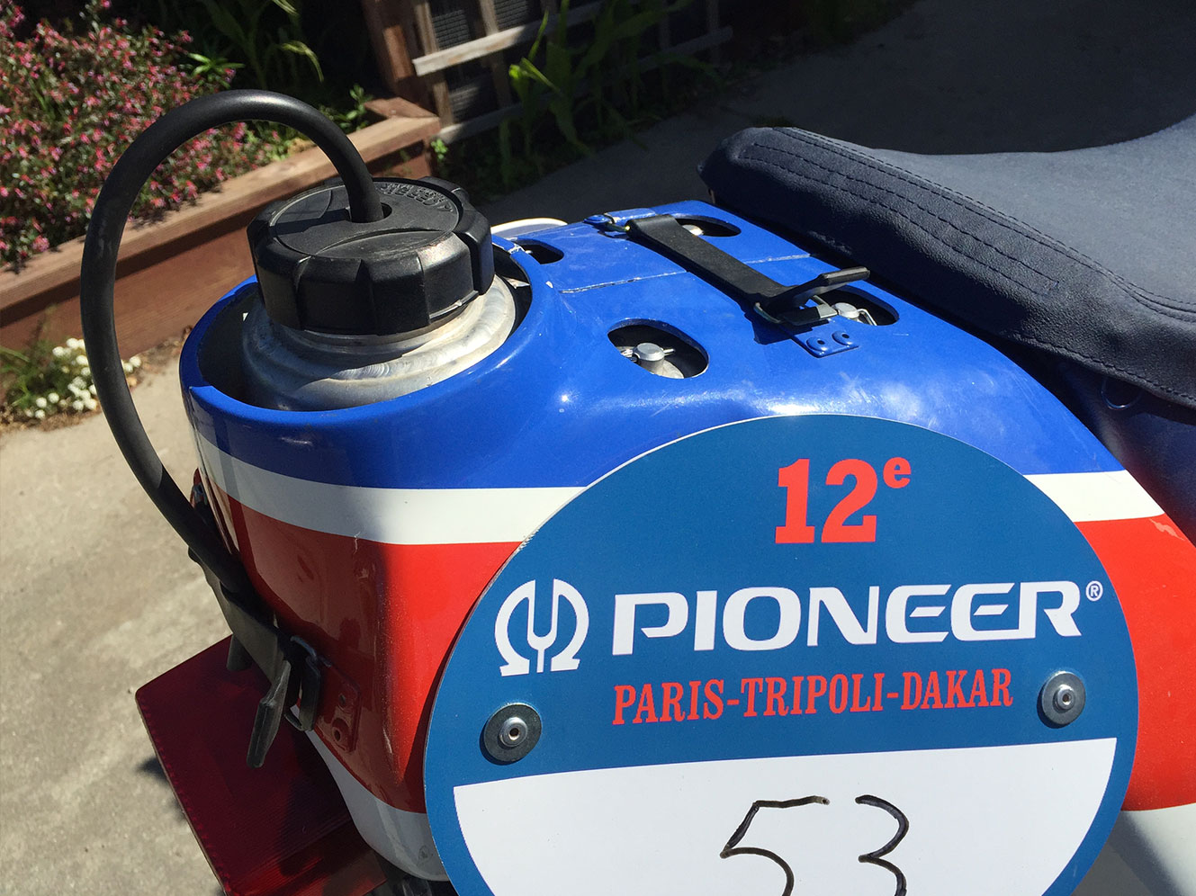 My Marathon was raced by Andreu Gonzalas of Spain in the 1990 Paris-Dakar Rally. From what I have been able to gather, Mr. Gonzalas, who also competed in the 1989 Marathon class on an Africa Twin, did not finish the race likely due to an injury. The photographs of Mr. Gonzalas show that at some point early in the race he must have had a crash that required the change of the front cowl and damaged the front brake guard. The scars of the most difficult race in the world!